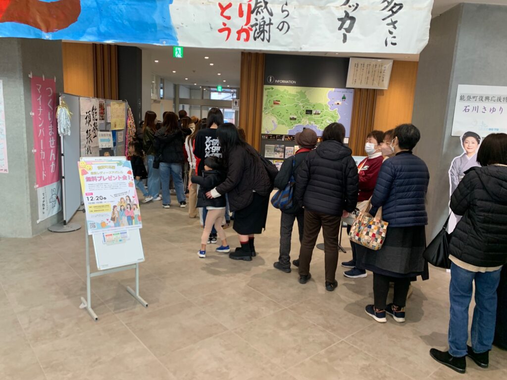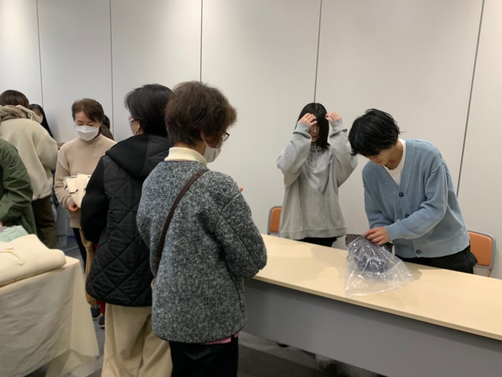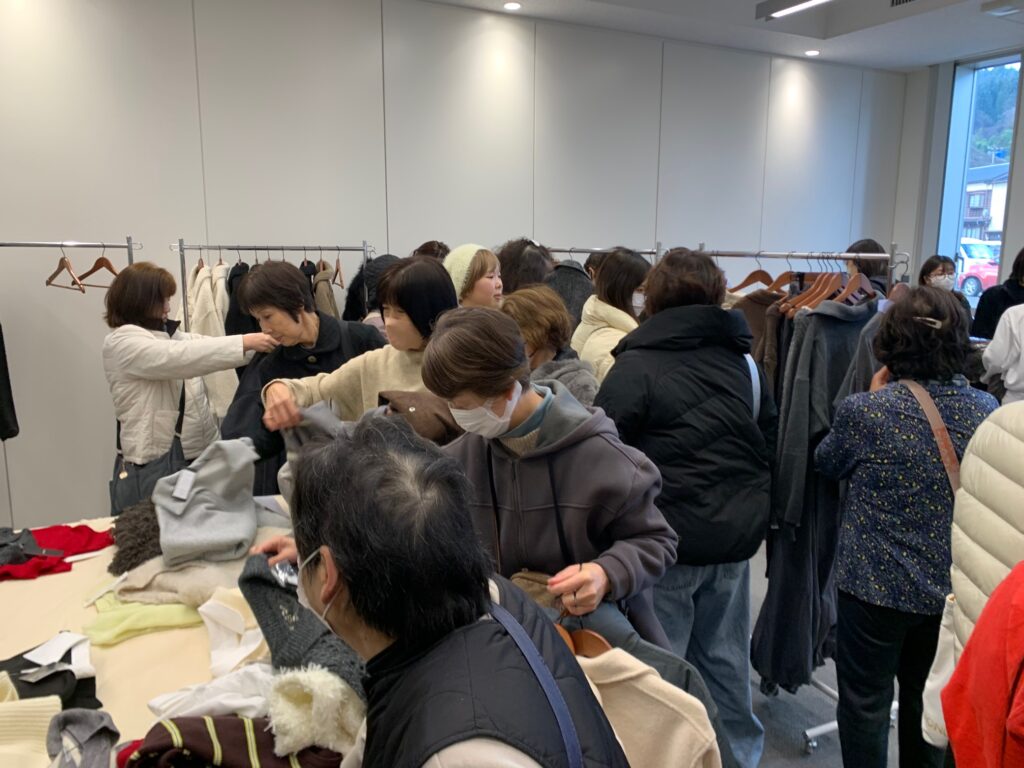 2025年12月20日(土)、能登町に在住・在勤の女性の皆様を対象として、能登役場の研修室をお借りして当社商品のレディースアパレルのプレゼント会を開催しました。10:00からスタートの予定でしたが、1時間前くらいから沢山の方にお並びいただき、約10分ほど前倒しでスタートしました。